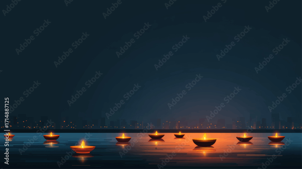 Floating diya lamps glowing on sacred river water during Kartik Purnima night celebration background. #1714887125