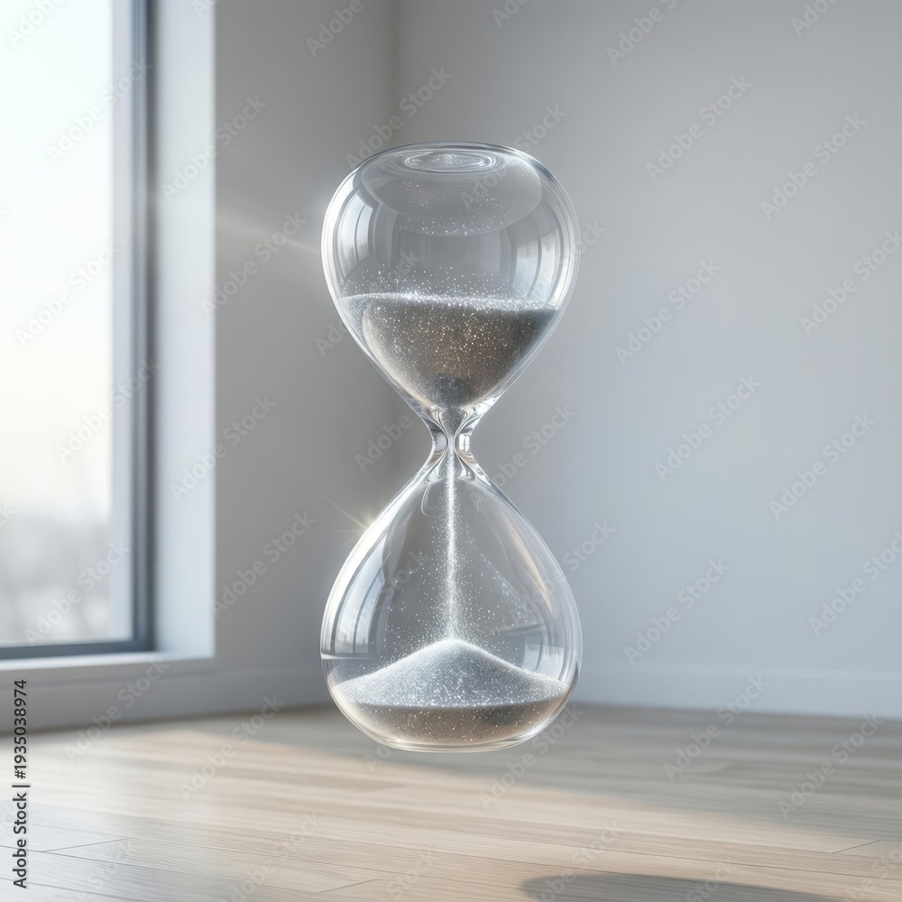 Floating hourglass with sparkling sand suspended mid-air near window, minimalist room, modern glass design #1935038974