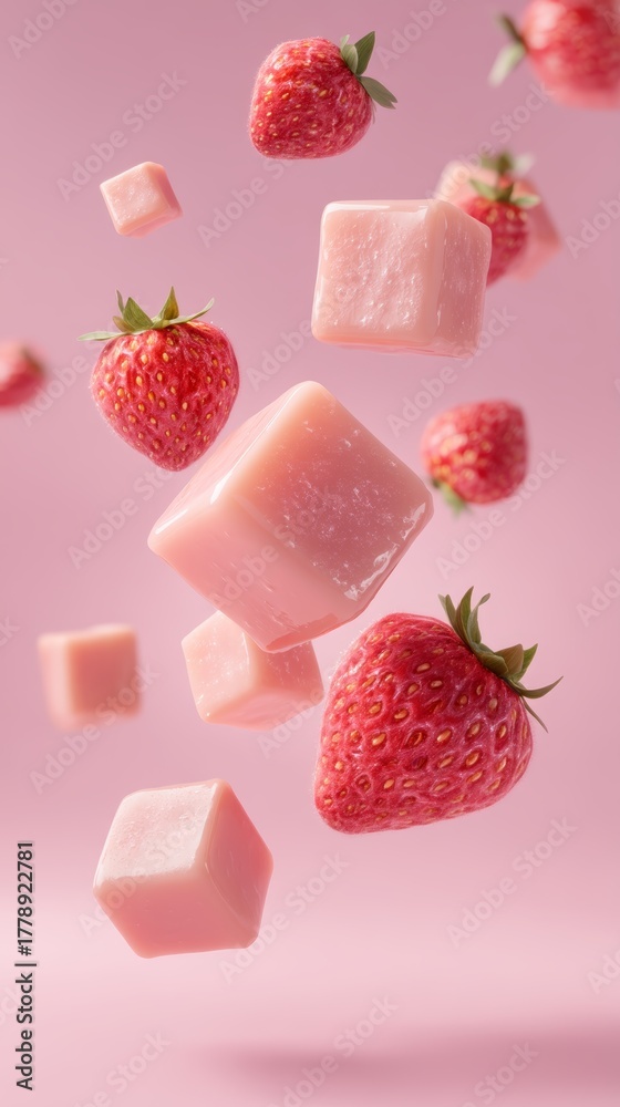 Floating Strawberries and Cubes of Strawberry Milk in Air #1778922781