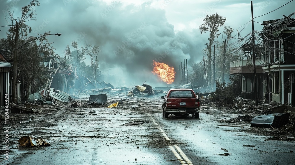 Flooded street, ravaged buildings, fire, vehicle. #1126447379