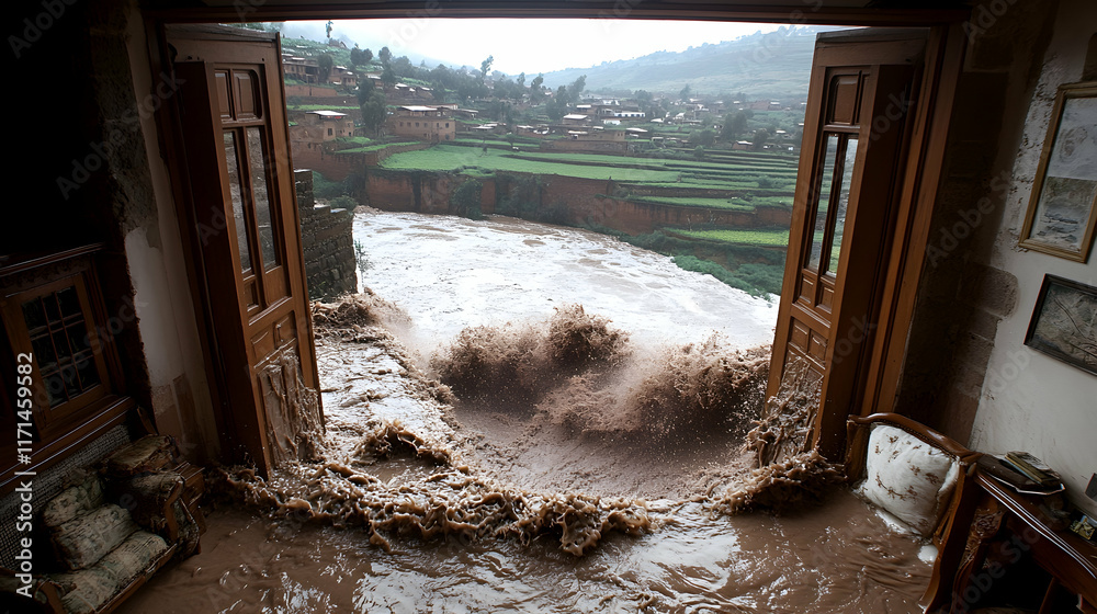 Floodwaters surge into a house through open doors, revealing a ravaged landscape. #1171459582