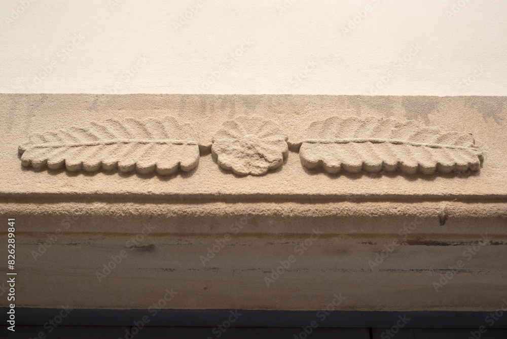 Flor y hojas decorativas talladas en piedra en dintel de puerta #826289841