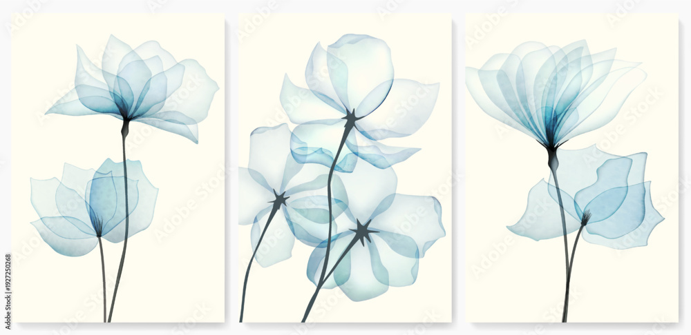 Floral cards with transparent flowers in a watercolor style. A botanical set for decor, wallpaper, textiles, prints, posters, and interior design. #1927250268