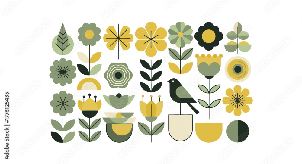Floral pattern with stylized flowers, leaves, and a bird in a pot, in shades of green and yellow. #1776125435
