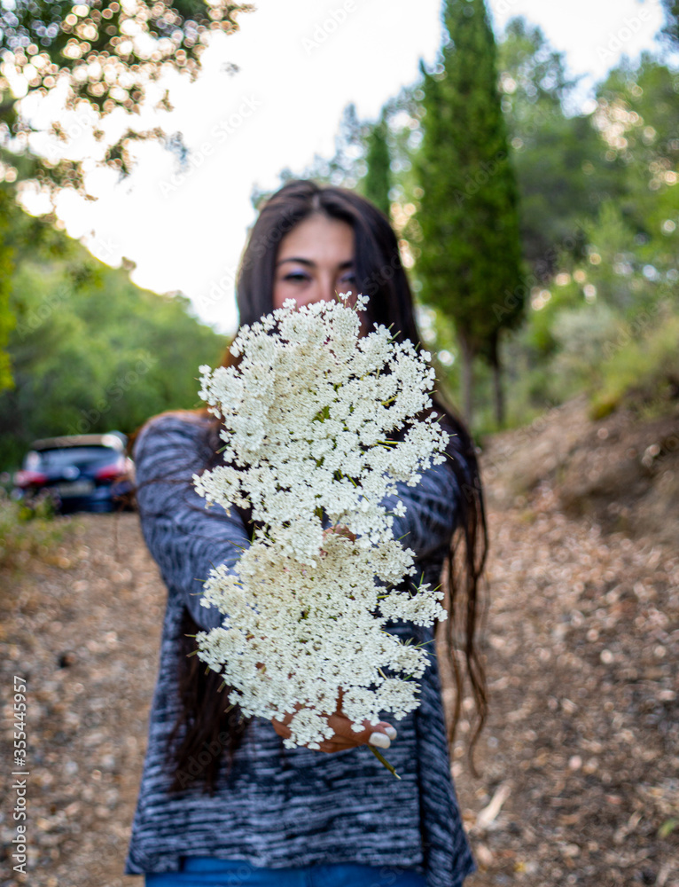 flores blancas en manos de una joven #355445957