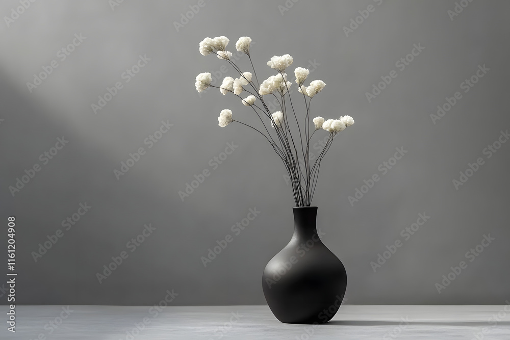 Flores secas blancas decorativas en un jarrón negro sobre fondo gris #1161204908