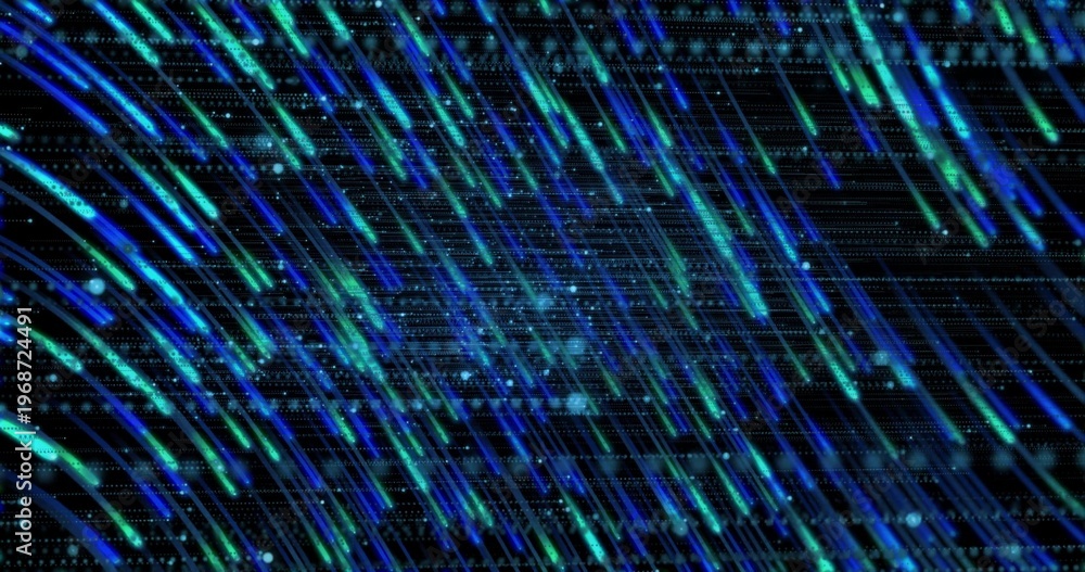 Flowing neon blue teal light streaks sweeping diagonally across deep black void with dot grid orbs #1968724491
