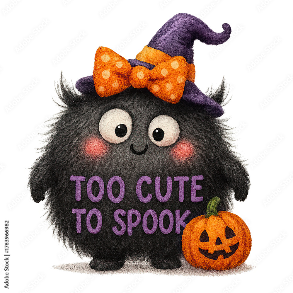 Fluffy black monster with rosy cheeks wears purple witch hat and orange polka-dot bow, beside carved pumpkin text reads "TOO CUTE TO SPOOK" in #1763966982