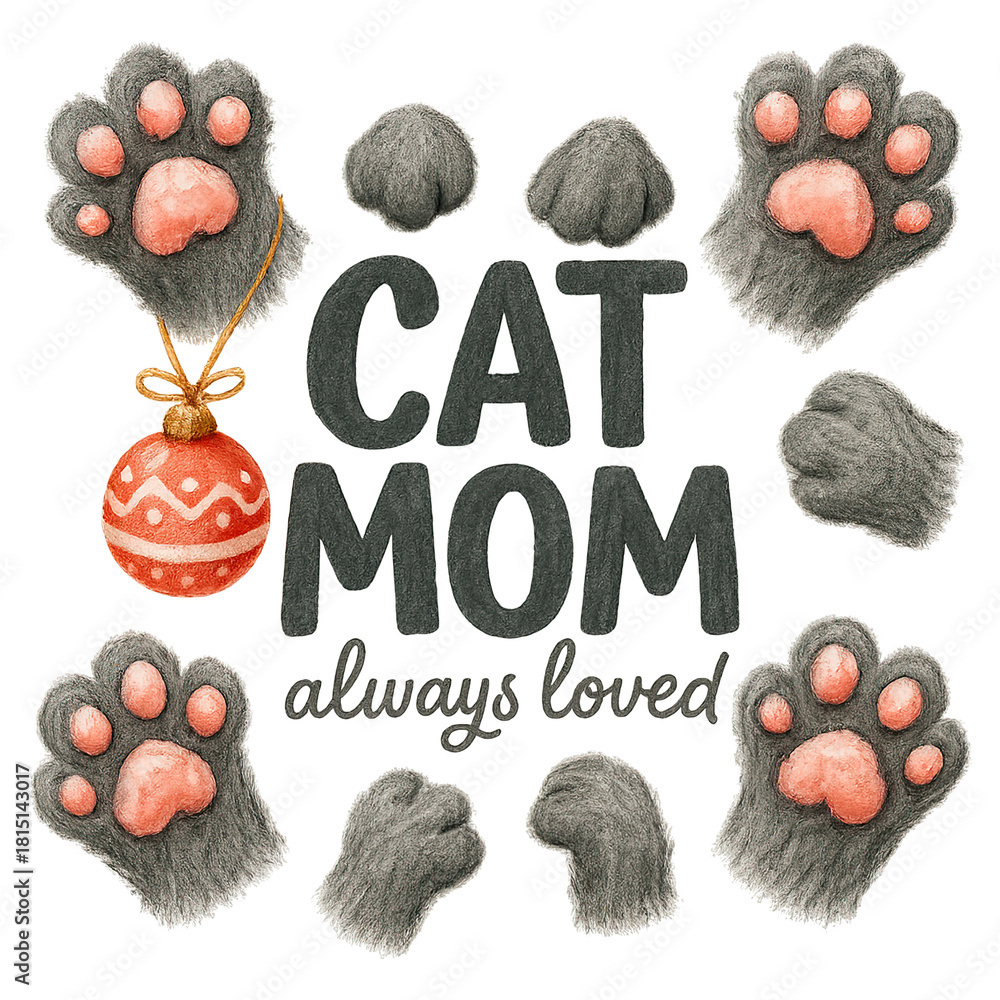 Fluffy gray cat paws surround phrase "CAT MOM always loved" with hanging red ornament #1815143017