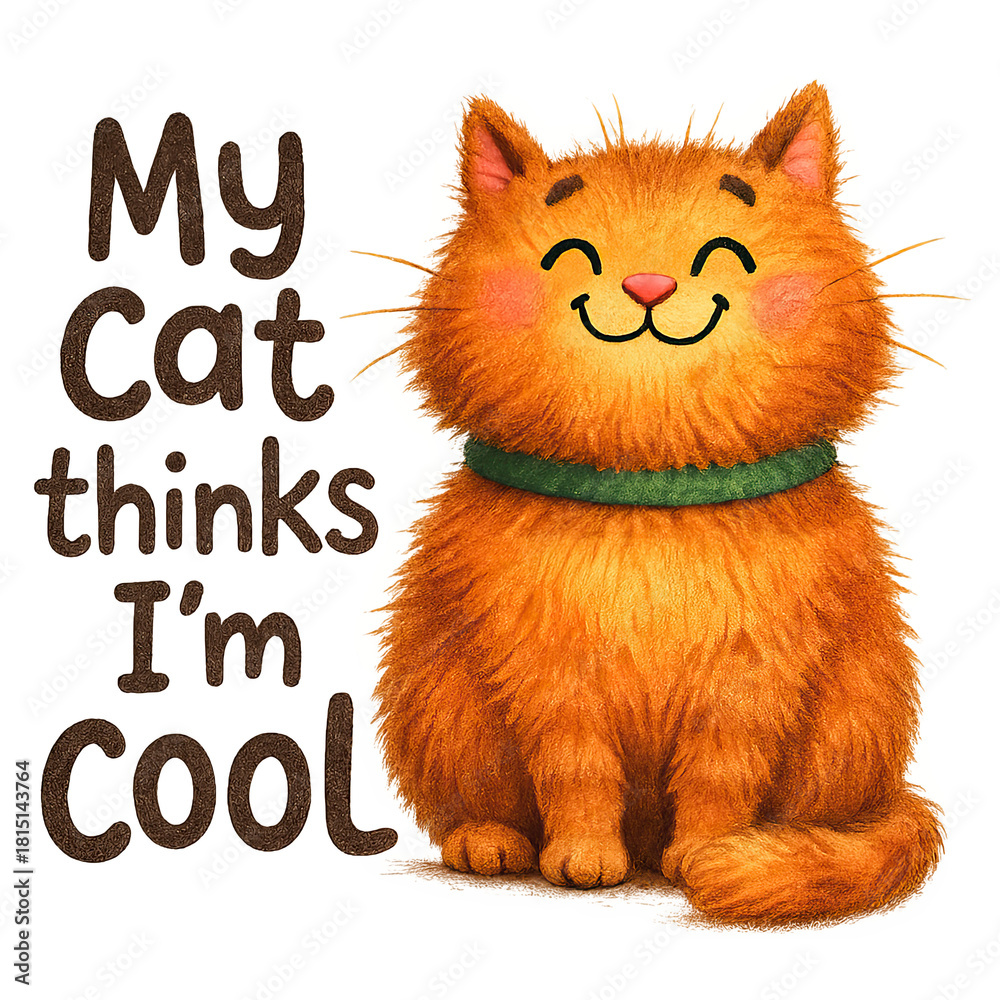 Fluffy orange cartoon cat with green collar sits beside text "My Cat thinks I'm COOL" on transparent background #1815143764