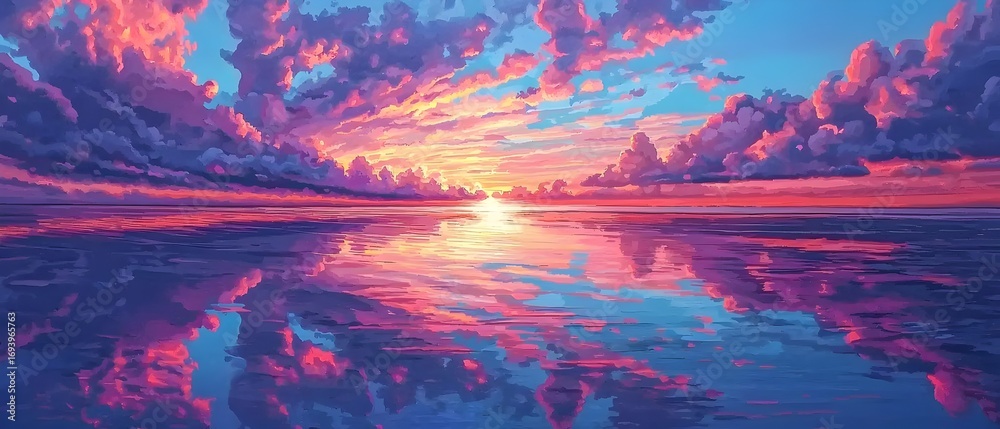 Fluffy pink and purple sunset clouds mirrored flawlessly on wide expanse of wet beach sand at low tide creating stunning symmetrical coastal beauty nature #1693965763