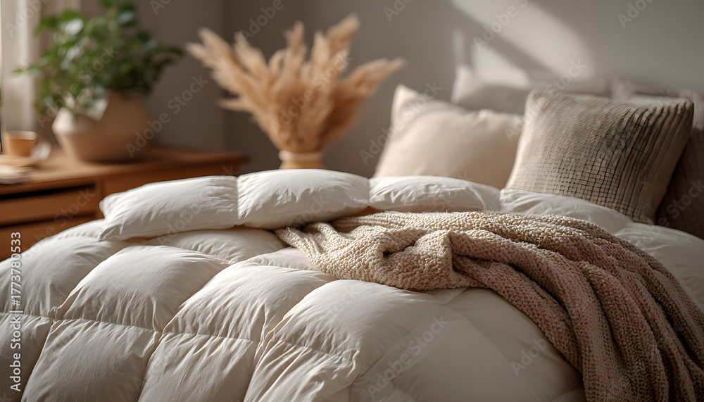 Fluffy white down comforter on bed with beige throw blanket, pillows. Soft, cosy bedding creates tranquil, dreamy atmosphere for ultimate relaxation, sleep. Minimalist, elegant home decor with #1773780533