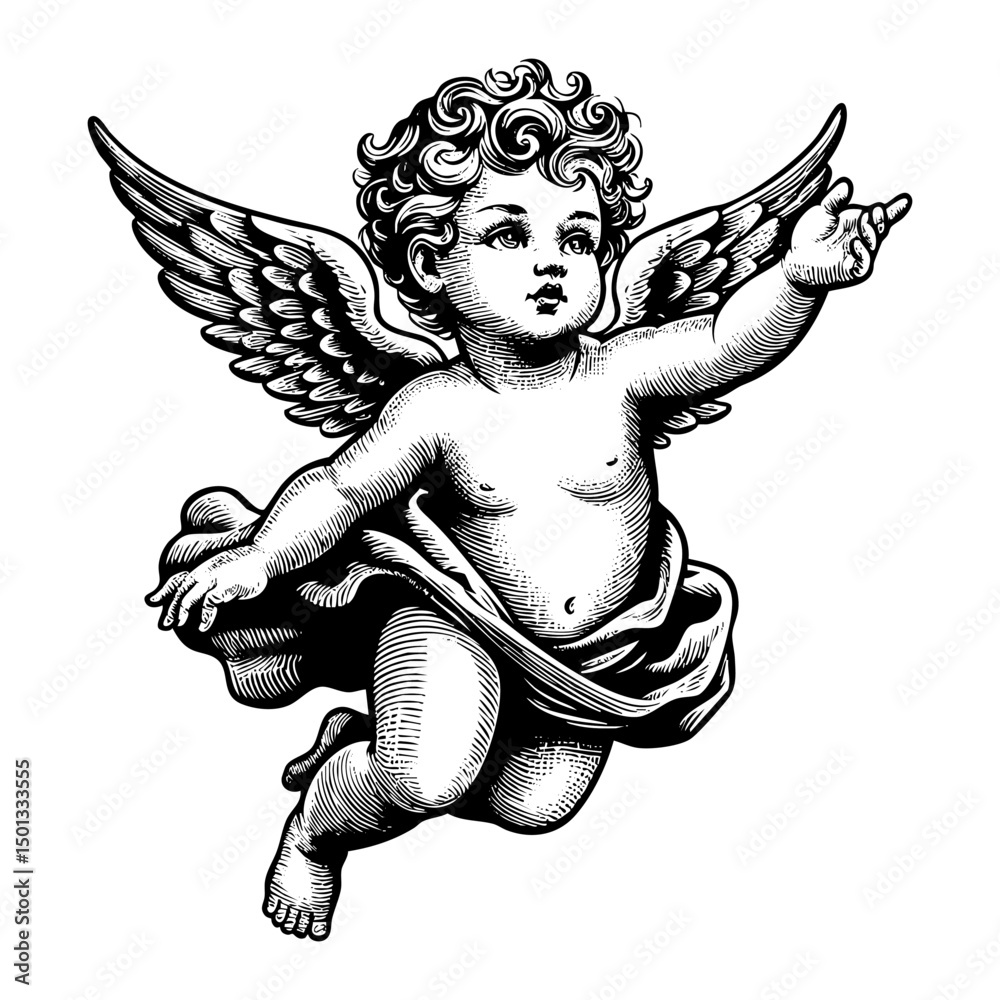 flying baby angel engraving black and white outline. Scratch board imitation. #1501333555
