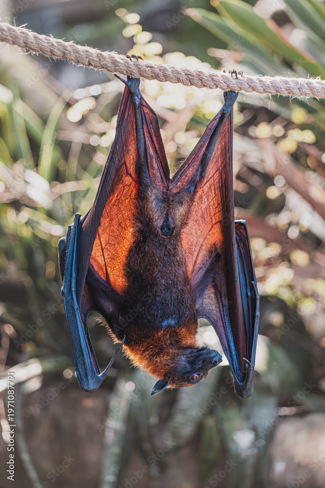 Flying fox hanging from a rope with large wings backlit by sunlight. Nocturnal mammal resting during the day #1971087791