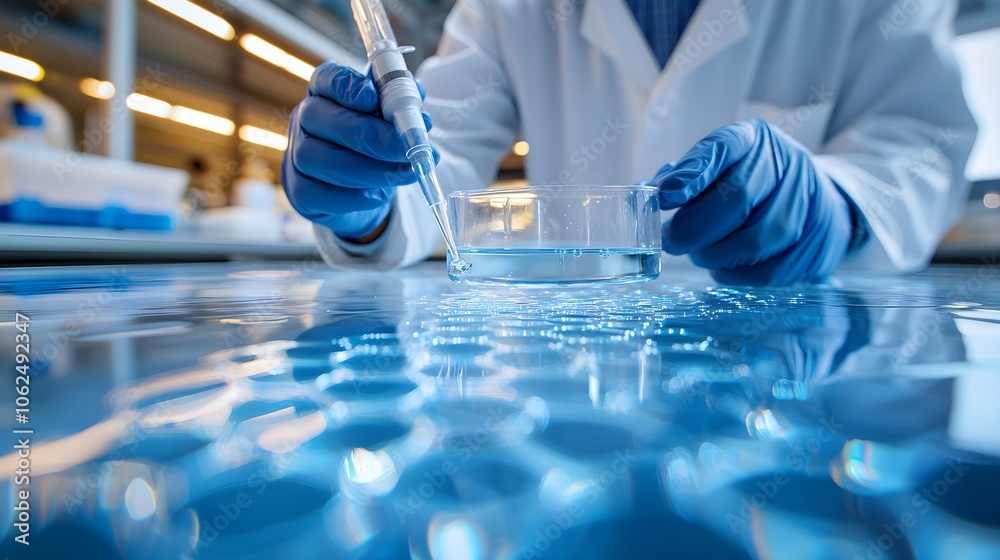 Focused environmental engineer in a lab coat examining polluted water with precision, close-up, detailed view of scientific equipment, contamination inspection #1062492347