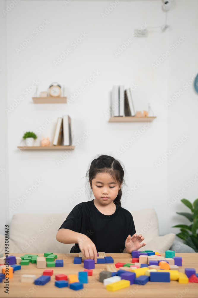 Focused girl building with colorful blocks on wooden table in modern living room, engaging in creative play, enhancing motor skills and cognitive development #1793009473