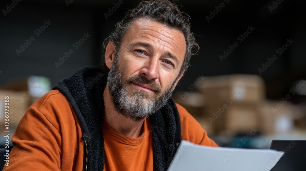 focused man with a beard is seated at a table in a warehouse. He is reviewing documents while surrounded by boxes and appears to be concentrating on his tasks #1766973883