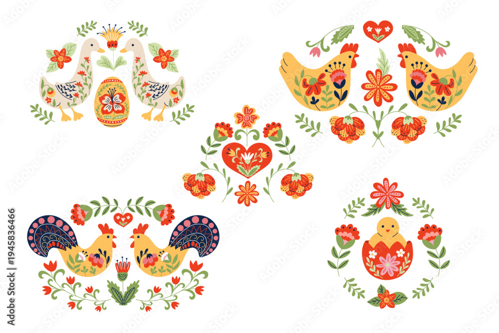 Folk art illustration showcases vibrant chickens and ducks surrounded by floral designs and hearts, ideal for seasonal decorations or cultural themes #1945836466