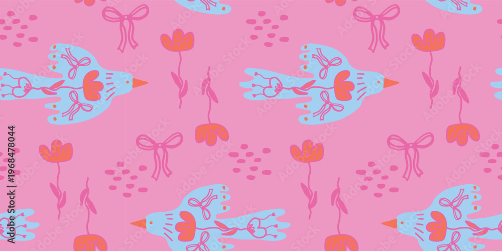 Folk style birds and wild flowers seamless pattern for romantic coquette themed stationery and fabrics #1968478044