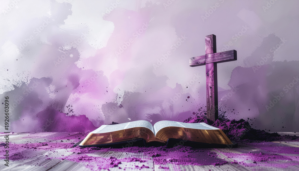 fondo abstracto religioso en acuarela morada con biblia y cruz cristiana #1926603096