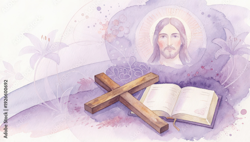 Fondo artistico religioso en acuarela de tonos purpuras claros, con imagen de Jesucristo, crucifijo y libro de biblia abierta. Concepto celebraciones catolicas o religiosas, semana Santa #1926600692
