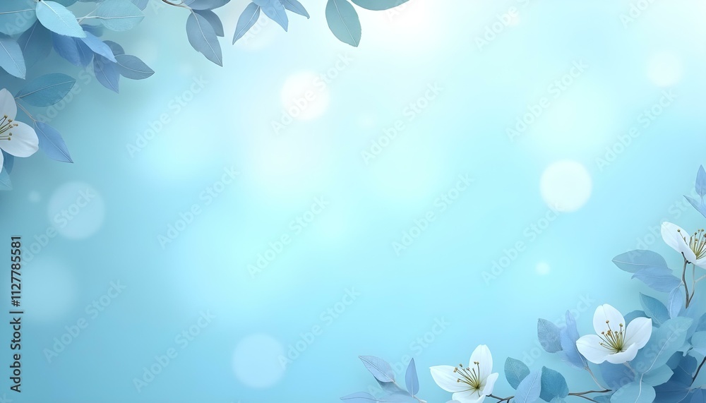 Fondo de primavera con fondo azul pastel, flores blancas y hojas delicadas en el borde #1127785581
