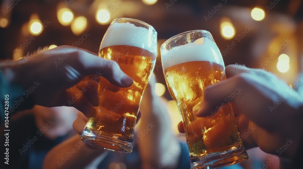 food and beverages At a pub or bar, male buddies are having a good time clinking glasses and sipping beer. #1044742805