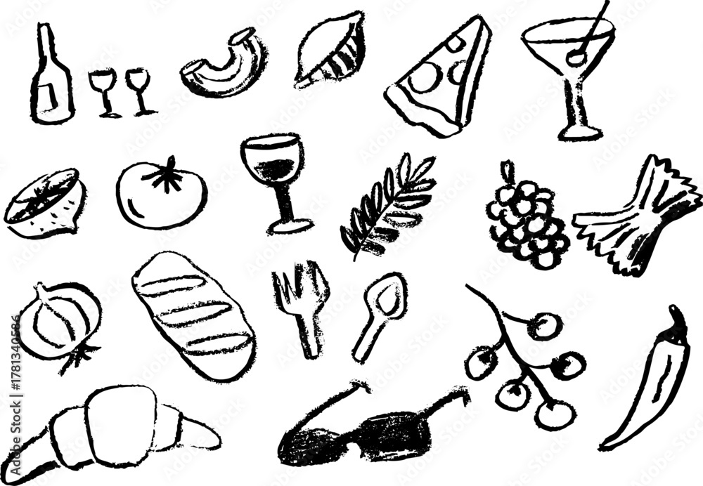 Food doodle set, a collection of black chalk style sketches featuring Italian cuisine, wine, and drinks. Hand drawn collection of ingredients and objects with a rough, whimsical texture. #1781340586