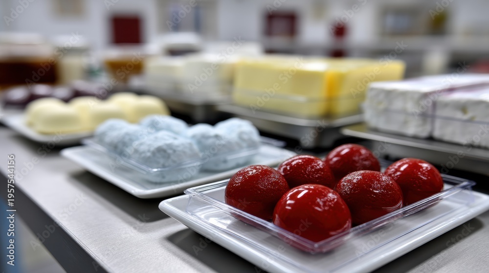 food safety measures, grocery store dairy items placed on lab scale with sample trays, ready for cross-contamination testing #1957544156
