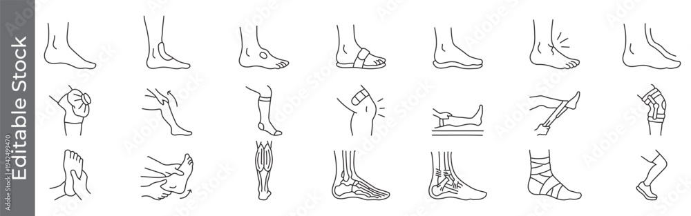 Foot, ankle and podiatry health icon set – editable outline symbols of pain, injury, swelling, leg, sprain, bandage and anatomy #1942499470