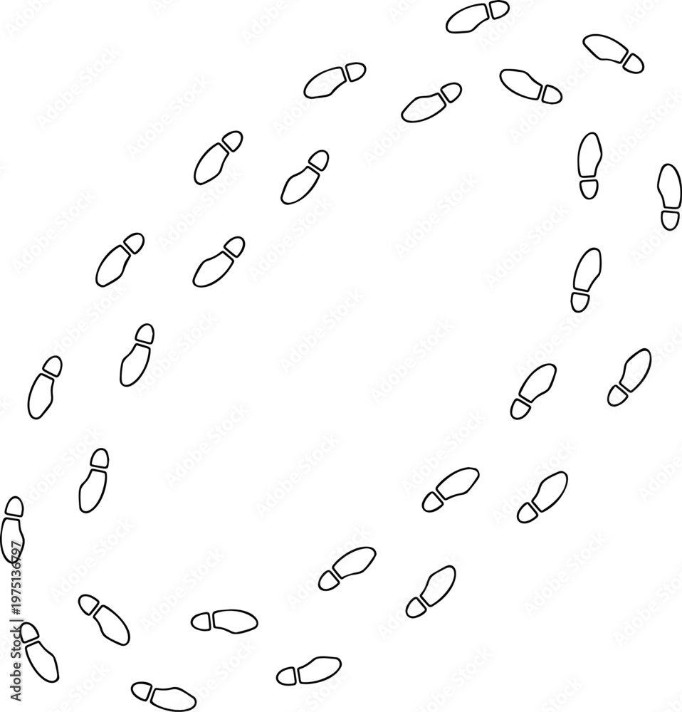 Footprint outline circle, thin line human shoe print track round path set on white. Minimalist walking person steps, footprint outline design, simple boot mark shape. Shoe print line art footprint #1975136797