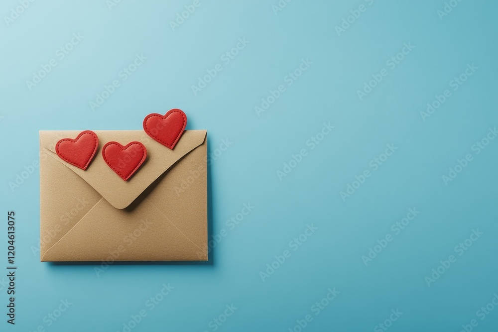 For Saint Valentine's Day, an arrangement includes an envelope, knitted hearts, and red paper hearts to express love, presented in a flat lay style. #1204613075