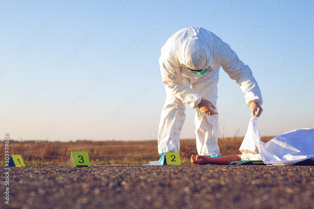 Forensic expert collecting evidence at the crime scene of a murder. #305979658