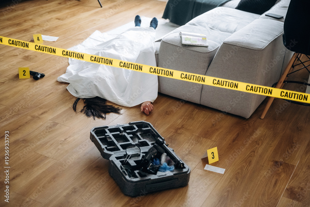Forensic investigation at a murder scene with a covered body on the floor, evidence markers, and a black toolbox in a residential living room setting #1936933793