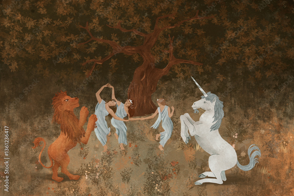 Forest nymphs dance in a magical forest with mythical animals, a lion and a unicorn #1361236417