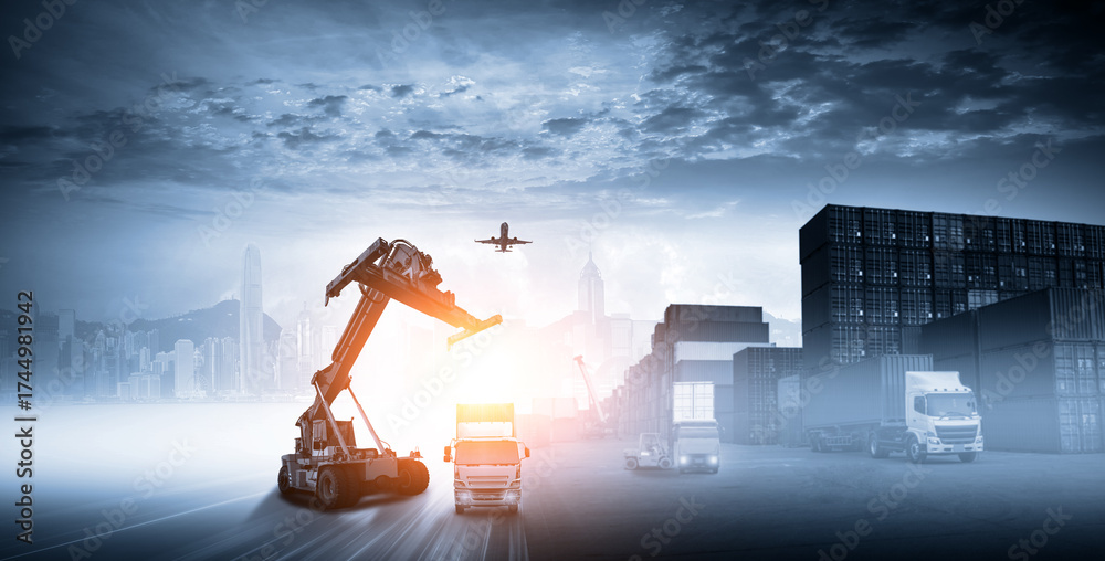 forklift handling container box loading to truck in import export logistic, Business logistics concept #1744981942