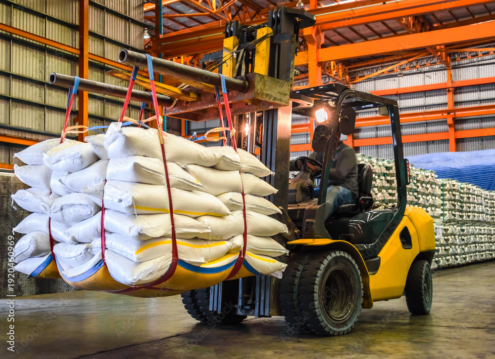 Forklift handling large white jumbo bags of refined sugar in an industrial warehouse for logistics and export. #1920460969