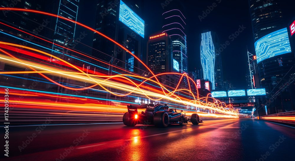 Formula One Car Races Through a Futuristic City at Night, Long Exposure Captures Light Trails #1742050366