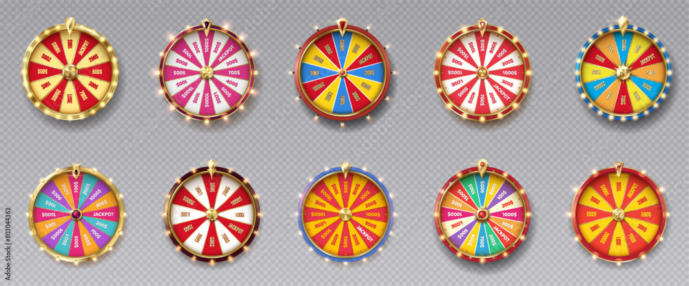 Fortune wheels colorful realistic vector illustration set. Luck win spin games. Casino roulettes 3d objects on transparent background #803044363