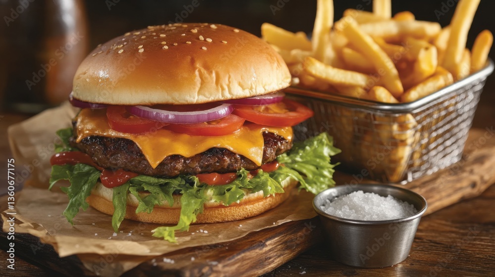 Fotografía de hamburguesa con papas fritas #1360677175