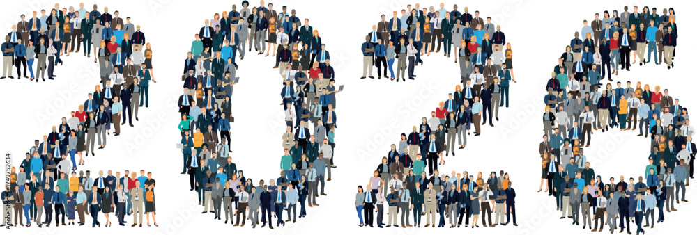 foule de personnages, d'employés d'une entreprise, gens d'une équipe réunis pour former le nombre 2026. Carte de vœux pour la nouvelle année sur fond blanc #1749752634