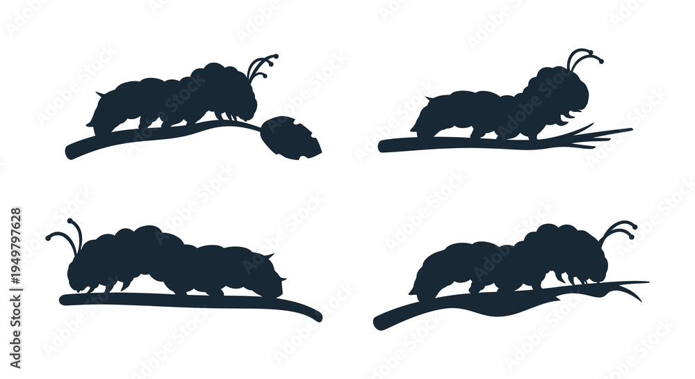 Four caterpillar silhouettes resting on branches displaying distinct poses and shapes silhouette high quality professional detailed #1949797628