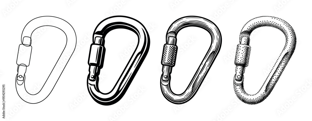 Four different styles of climbing carabiners are illustrated in a black and white vector art collection for outdoor adventure. #1934293295