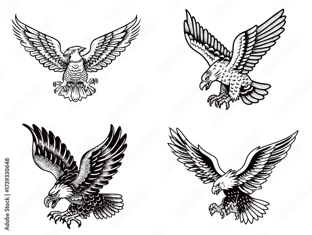 Four distinct illustrations of eagles are displayed, each highlighting a different style and pose. The detailed designs emphasize the birds wings, claws, and fierce expressions. #1739330648