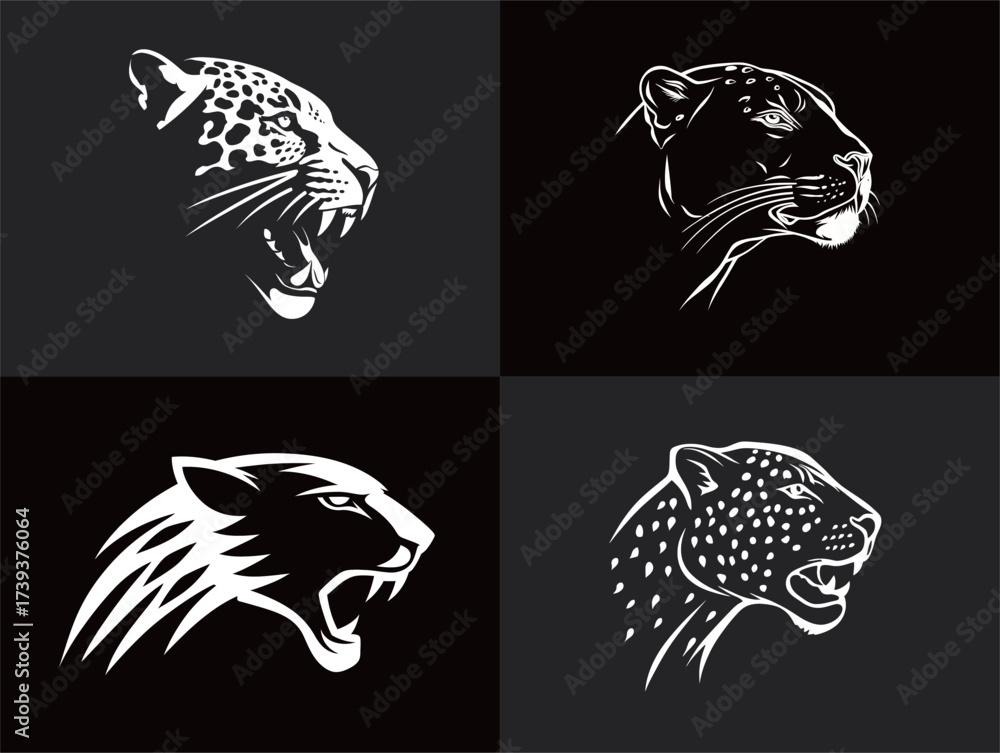 Four illustrations showcase various big cat heads, including a leopard and a jaguar, featuring bold and striking designs against dark backdrops. #1739376064