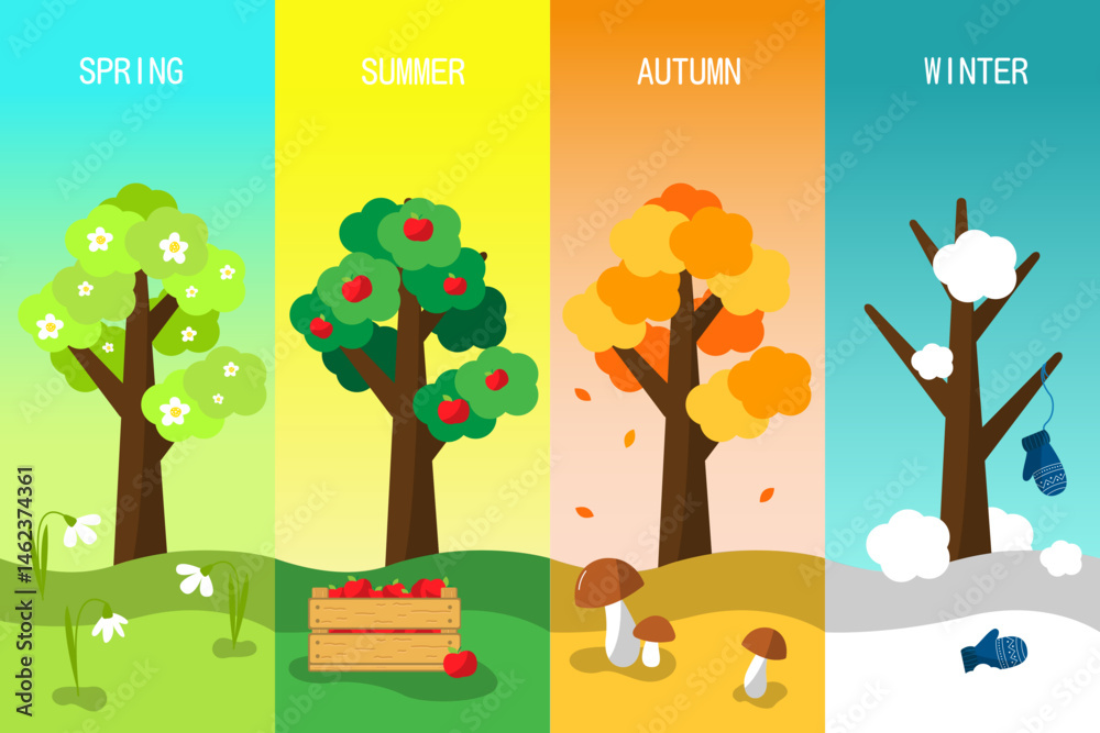 Four seasons set. winter, spring, summer, autumn. Tree at different times of the year. Cartoon Flat Style Illustration #1462374361