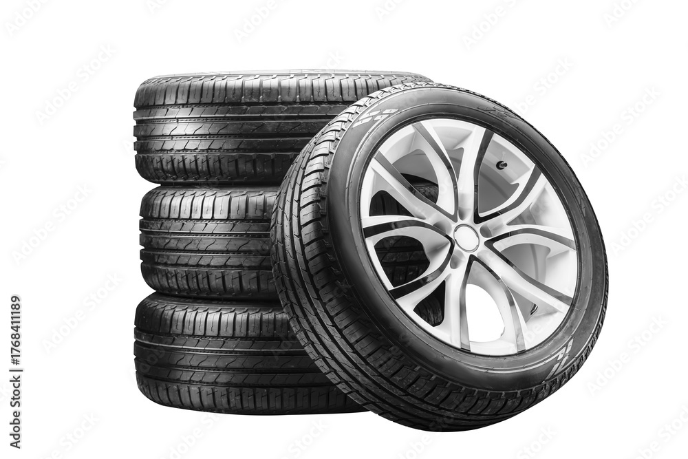 Four summer tires mounted on alloy wheels are neatly stacked, showcasing their design and tread. This setup highlights seasonal tire service and sales opportunities. #1768411189