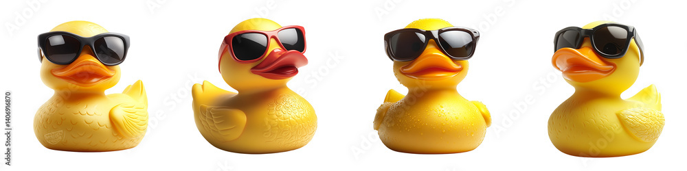Four yellow rubber ducks wearing stylish sunglasses on transparent background #1406916870