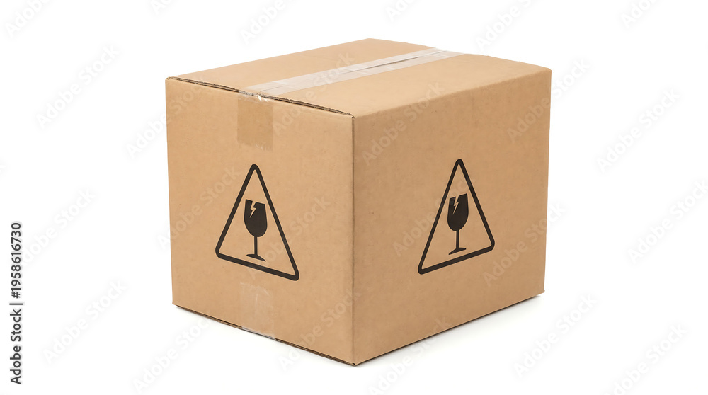 Fragile Package: An iconic cardboard box, adorned with prominent fragile symbols, stands ready to protect its delicate contents during transit. #1958616730