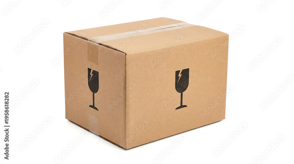Fragile Package: An ordinary cardboard box with clear fragile symbols, symbolizing the careful handling of transported goods. #1958618282